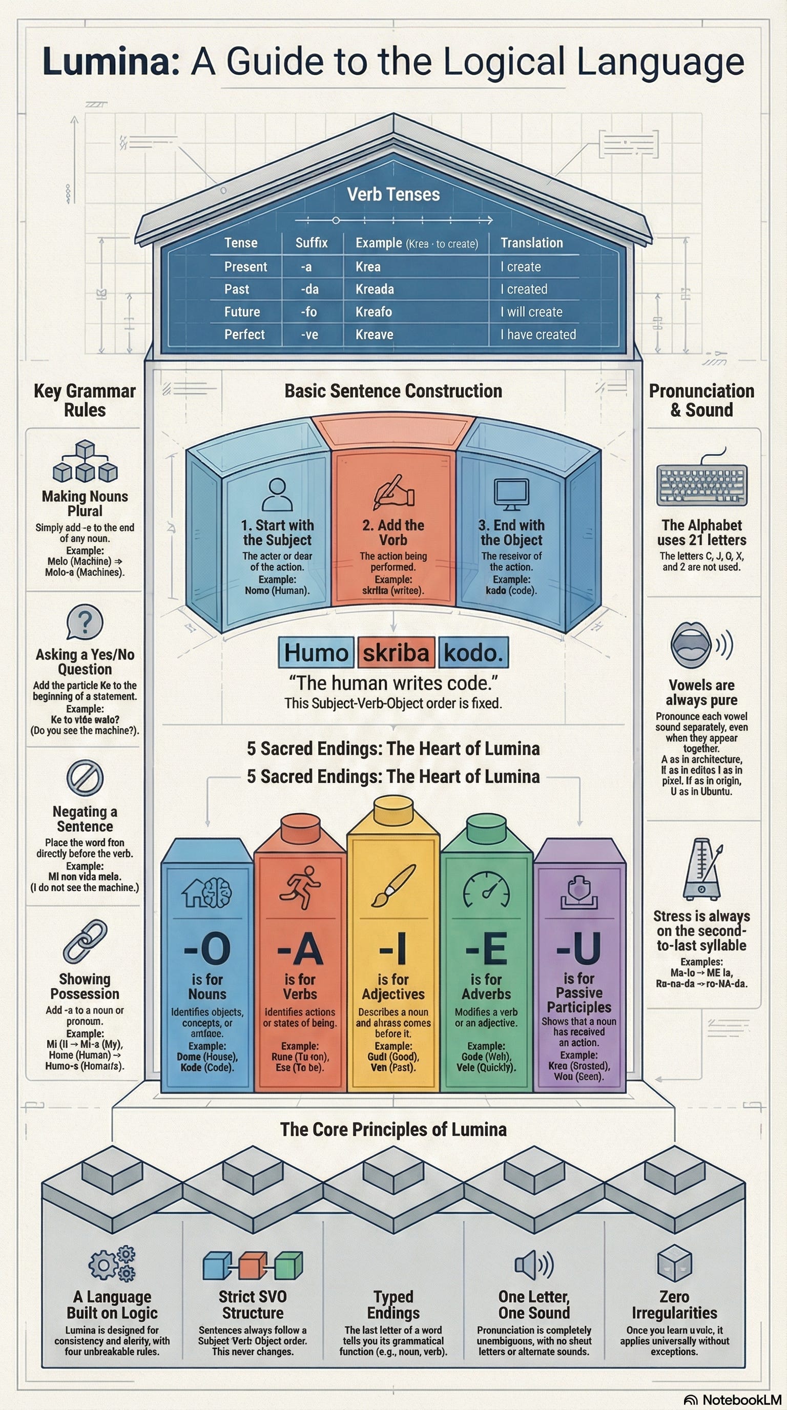 Lumina is a constructed auxiliary language designed for logical consistency, ease of pronunciation, and machine learnability.